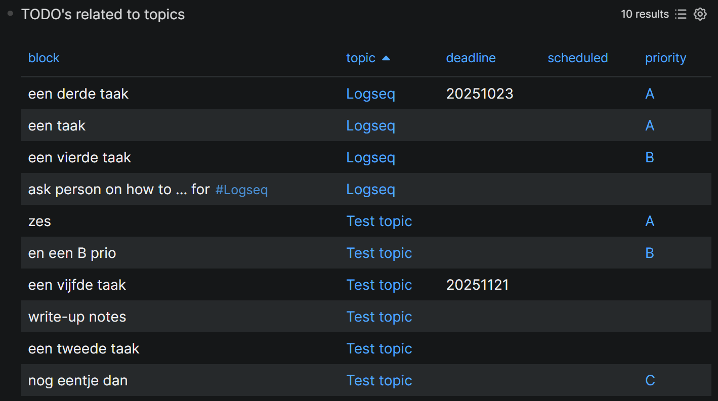 After using the tool a while, I noticed I’d like to retrieve specific lists. Lists of task related to specific pages. So, now, I am flagging pages with a topic:: property. And when active, I like to see all tasks related to it and when suspended or not marked, they are irrelevant. Next to that, I wanted to see tasks that are implicitly tagged meaning instead of the block having a tag, it should also pop up when the parent has the tag. This is especially handy when having a meeting discussing multiple topics and suddenly a task pops up.